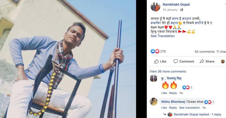 യുവാവിന്റെ ഫെയ്സ്ബുക്ക് പ്രൊഫൈലില് ബി.ജെ.പി–ആര്.എസ്.എസ്, ബജ്റംഗ് ദള് പ്രവര്ത്തകനെന്നാണ് രേഖപ്പെടുത്തിയിട്ടുണ്ട് . ബജ്റംഗ്ദള് നേതാക്കള്ക്കൊപ്പം നില്ക്കുന്ന ചിത്രങ്ങളും വിവിധ ആയുധങ്ങള് കയ്യിലേന്തിയിരിക്കുന്ന ചിത്രങ്ങളം ഫെയ്സ്ബുക്കില് പങ്കുവെച്ചിട്ടുണ്ട്.