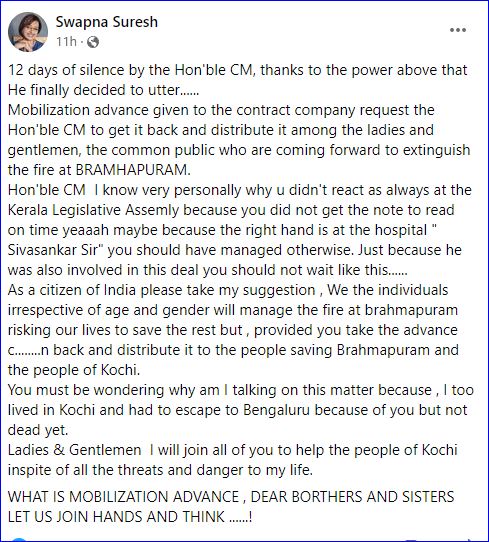വലംകൈ ആശുപത്രിയിലായതിനാൽ വായിക്കാൻ സമയത്ത് കുറിപ്പ് കിട്ടിക്കാണില്ലെന്നും കുറിപ്പിൽ പരിഹസിക്കുന്നു. കരാർ കമ്പനിക്ക് നൽകിയ മൊബിലൈസേഷൻ അഡ്വാൻസ് തിരികെ വാങ്ങി, അവിടെ തീ അണയ്ക്കാൻ യത്നിച്ചവർക്ക് നൽകണമെന്നും സ്വപ്ന പറയുന്നു.