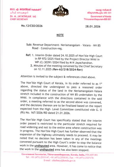 തിരുവനന്തപുരം | കൊച്ചി ധനുഷ്കോടി ദേശീയപാതയിൽ നേര്യമംഗലം – മുതൽ വാളറ, വരെ പ്രദേശത്തെ ദേശീയപാത വികസനം തടഞ്ഞു ചീഫ് സെക്രട്ടറി ഉത്തരവിറക്കി .കൊച്ചി ധനുഷ്കോടി ദേശീയപാത (NH-85) 14.5 കിലോമീറ്റർ ദൂരത്തിൽ തർക്കമില്ല സ്ഥലത്ത് നിർമ്മാണം നടത്തുന്നതിനാണ് ചീഫ് സെക്രട്ടറി Dr. എ . ജയതിലക് (Dr. A. JAYATHILAK IAS ) ഇന്നലെ ഉത്തരവിട്ടിരിക്കുന്നത്