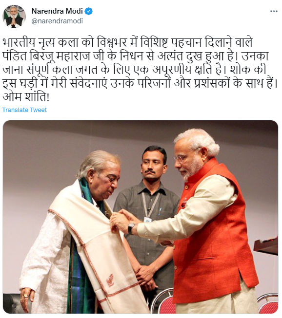 പണ്ഡിറ്റ് ബിർജു മഹാരാജിന്റെ വിയോഗത്തിൽ പ്രധാനമന്ത്രി നരേന്ദ്ര മോദി ദുഃഖവും അനുശോചനവും രേഖപ്പെടുത്തി.