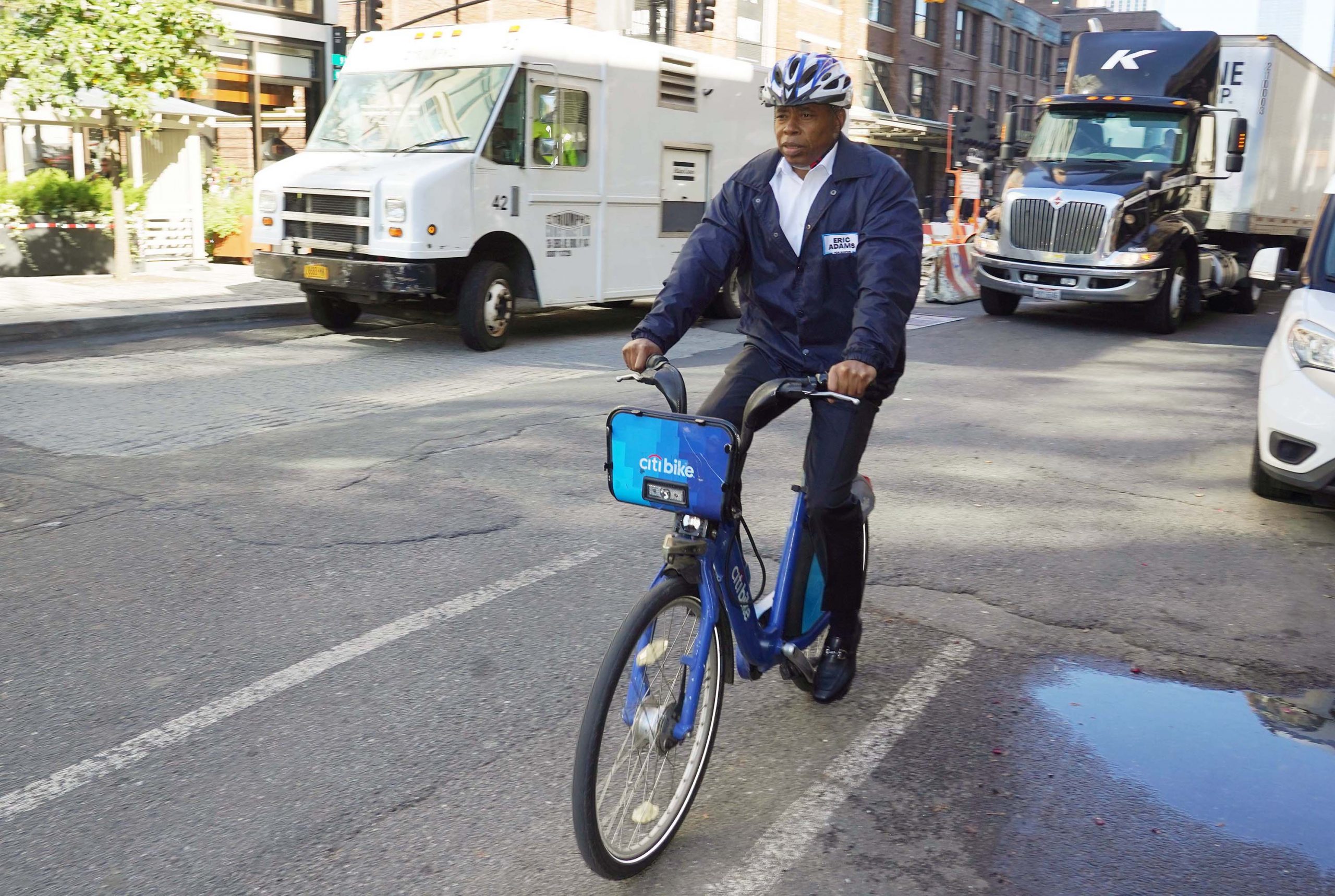സെക്യൂരിറ്റികളുടെ അകമ്പടിയോടുകൂടി മാത്രം സഞ്ചരിച്ചിരുന്ന മുന് മേയര്മാരില് നിന്നും തികച്ചും വ്യത്യസ്ഥനായി മേയറായി സത്യപ്രതിജ്ഞ ചെയ്തതിന്റെ രണ്ടാംദിനം (ജനുവരി 2 ഞായറാഴ്ച) രാവിലെ എറിക് ആഡംസ് ഓഫീസിലെത്തിയത് ചുവന്ന ഹെല്മെറ്റ്, ചുവന്ന ടൈ, ബ്ലൂ സ്യൂട്ട് എന്നിവ ധരിച്ചാണ് എത്തിയത്. മേയര് തന്നെയാണ് തന്റെ ട്വിറ്റര് അക്കൗണ്ടില് യാത്രയെക്കുറിച്ചുള്ള വിവരങ്ങള് വെളിപ്പെടുത്തിയത്.