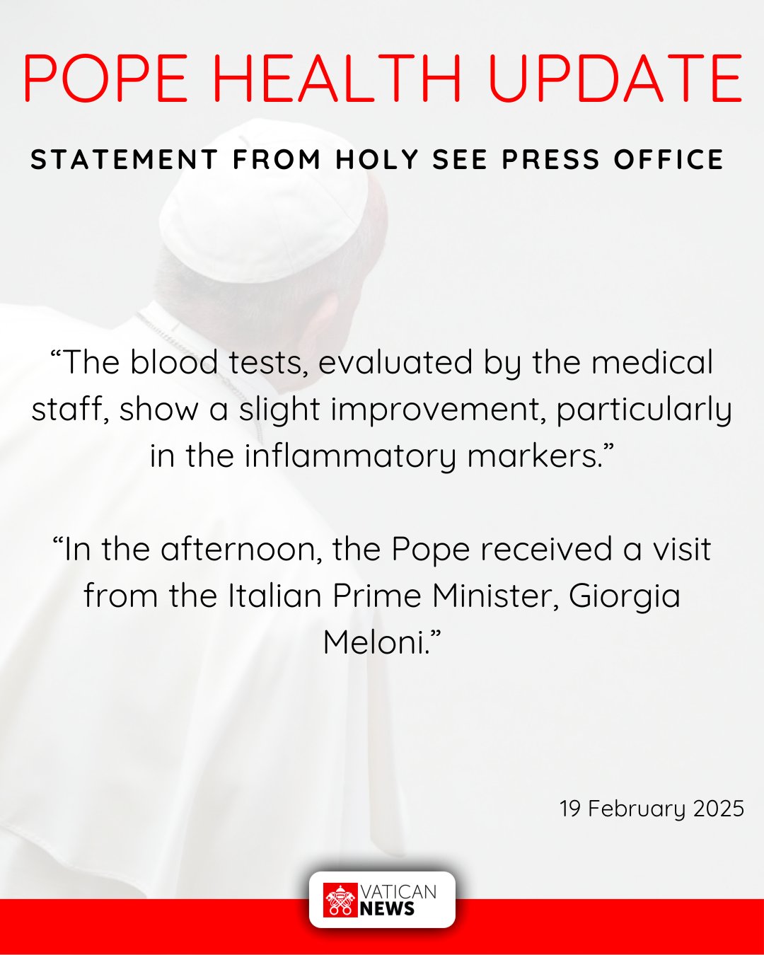 അതേസമയം, തനിക്ക് സാമീപ്യമറിയിച്ചവര്ക്ക് നന്ദി പ്രകടിപ്പിച്ച പാപ്പാ, പ്രാര്ത്ഥനകള് തുടരാന് ഏവരോടും അഭ്യര്ത്ഥിച്ചു. പനി, നാഡി വേദന, ഹെര്ണിയ എന്നിവയുള്പ്പെടെ സമീപ വര്ഷങ്ങളില് മാര്പാപ്പയ്ക്ക് അനാരോഗ്യം ബാധിച്ചിരുന്നു.ശ്വാസകോശത്തിൽ കടുത്ത അണുബാധ ഉണ്ടെന്നും ചികിത്സയിൽ മാറ്റം ആവശ്യമാണെന്നും വത്തിക്കാൻ നേരത്തെ അറിയിച്ചിരുന്നു. രണ്ട് ശ്വാസകോശങ്ങളിലും കടുത്ത ന്യുമോണിയ ബാധിച്ച പോപ്പിന് ആന്റിബയോട്ടിക് ചികിത്സ തുടരുകയാണ്. ചികിത്സയ്ക്കിടെയാണ് ശ്വാസകോശ അണുബാധയിൽ ഇപ്പോള് കുറവുണ്ടായതായി വത്തിക്കാൻ അറിയിച്ചത്