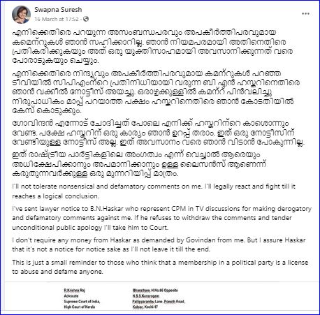 ”മാനനഷ്ടക്കേസുമായി ബന്ധപ്പെട്ട് ഏതു നിയമ നടപടികളും നേരിടാൻ തയാറാണ്. ഫേസ്ബുക്ക് ലൈവിൽ എല്ലാ വിവരങ്ങളും വളരെ വ്യക്തമായി മലയാളത്തിൽതന്നെ പറയുന്നുണ്ട്. പറഞ്ഞ കാര്യങ്ങൾ വീണ്ടും കേൾക്കണം. വിജയ് പിള്ള പറഞ്ഞ കാര്യങ്ങൾ മാത്രമാണ് വെളിപ്പെടുത്തിയത്. എം വി ഗോവിന്ദനാണ് വിജയ് പിള്ളയെ അയച്ചതെന്ന് ഒരിടത്തും പറയുന്നില്ല.