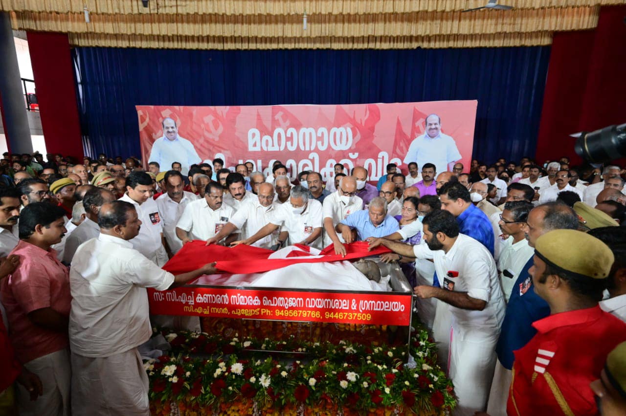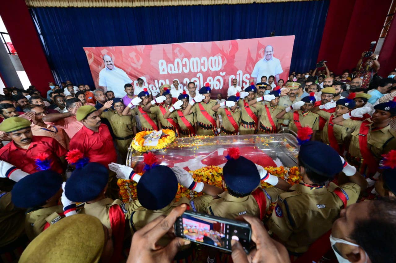 കോടിയേരി ബാലകൃഷ്ണന്റെ (68) ഭൗതീകശരീരത്തിൽ ചെങ്കൊടി പുതപ്പിച്ച് മുഖ്യമന്ത്രി പിറണായി വിജയൻ. ഇല്ലാ, ഇല്ലാ മരിക്കുന്നില്ല പ്രിയ സഖാവ് മരിക്കുന്നില്ലെന്ന മുദ്രാവാക്യം വാനിൽ ഉയർന്നു. മുഖ്യമന്ത്രിയും മുതിര്ന്ന നേതാക്കളും ചേര്ന്ന് കോടിയേരിയെ ചെങ്കൊടി പുതപ്പിച്ചു. അങ്ങനെ രാഷ്ട്രീയ കേരളം കോടിയേരിക്ക് വിട പറയുകയാണ്. തലശേരിൽ ടൗൺ ഹാളിൽ നടന്ന പൊതുദർശന ചടങ്ങിലാണ് ചെങ്കൊടി പുതപ്പിച്ചത്. അതുകണ്ട് നിന്ന പാർട്ടി അണികൾക്കും നേതാക്കൾക്കും സങ്കടം അടക്കാനായില്ല. പുഞ്ചിരിക്കുന്ന മുഖവുമായി എന്നും എല്ലാവരേയും വരവേറ്റ കോടിയേരിയുടെ ഭൗതീകശരീരം കണ്ട് നേതാക്കളുൾപ്പെടെയുള്ളവരുടെ കണ്ണുകൾ നിറഞ്ഞൊഴുകി.ഭൗതീകശരീരം തലശേരി ടൗൺ ഹാളിൽ എത്തിച്ചപ്പോൾ വികാര നിർഭരമായ നിമിഷത്തിനാണ് ടൗൺ ഹാൾ സാക്ഷ്യം വഹിച്ചത്. മൃതദേഹം ടൗൺ ഹാളിൽ എത്തിച്ചതിന് പിന്നാലെയാണ് കോടിയേരിയുടെ ഭാര്യ വിനോദിനി ടൗൺ ഹാളിൽ എത്തിയത്. എന്നാൽ കോടിയേരിയെ കണ്ട മാത്രയിൽ തന്നെ സങ്കടം അടക്കിപ്പിടിക്കാനാകാതെ ഭാര്യ പൊട്ടിക്കരഞ്ഞു. എന്റെ പൊന്ന് ബാലേട്ടാ, എന്നെ ഒന്ന് നോക്കു എന്ന് ഉറക്കെ വിനോദിനി നിലവിളച്ചപ്പോൾ സഖാക്കളുടെയും സഹപ്രവർത്തകരുടെയുമെല്ലാം കണ്ണുകൾ നിറഞ്ഞൊഴുകി. ആർത്തു വിളിച്ച മുദ്രവാക്യങ്ങളുടെ ശബ്ദം പോലും ഇടറി. അമ്മയെ മകൻ ബിനീഷ് കോടിയേരി ചേർത്തു പിടിച്ചെങ്കിലും വിഷമം താങ്ങാനാകാതെ വിനോദിനി തളർന്നു വീണു. തുടർന്ന് മകനും പാർട്ടി പ്രവർത്തകരും ചേർന്ന് വിനോദിനിയെ അവിടെ നിന്നും മാറ്റുകയായിരുന്നു.